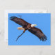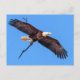 An eagle photographed with a large stick to add to  its nest, against a vivid blue sky.