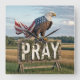 A bald eagle draped in an American flag perches on a rustic wooden sign that reads "PRAY" decorated with green foliage