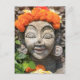 Detail of Balinese carved statue with colourful flower decoration in Ubud, Bali