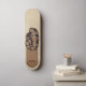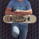 This skateboard features a realistic style illustration of a coiled ball python snake in dark brown and tan. It's ready to be personalized with a name in dark brown lettering. Makes a great gift for pet snake owners.