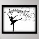 Simple black silhouette of a ballet dancer with fancy music bar and notes