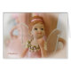 A photographic fine art card of a pink ballerina fairy figurine. She is surrounded by pink vases with a soft background edged in white.