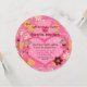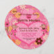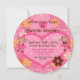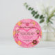 An adorable birthday invitation in round circular shape with lots of pink, hearts, flowers, and little ballerina monkeys with areas you can easily add all of her birthday party specifics!