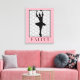 A silhouette of a ballerina posing on the tips of her toes with her hands raised above her head. Surrounded by a lacy looking, black and white heart and flower shaped mandala pattern. The word ballet written underneath in a parisian style art deco font.