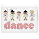 Five adorable ballerinas dance on this design, decked out in costume and shoes. Pink "dance" word below them.
