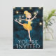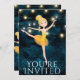 This stunning ballet design features the cutest blonde ballerina with a yellow tutu dancing on the word's "You're Invited" in front of a deep blue background with gorgeous string lights. Easily customise with your party information!