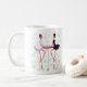 CUTE BALLET MUG. TWO BALLERINAS AT A CAFE, ODETTE AND ODILE FROM SWAN LAKE BALLET. THE DANCERS WEAR A BLACK AND WHITE TUTU AND ARE SURROUNDED BY COLOR BUBBLES. DRAWING BY MARCELA BLANCO