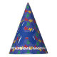 This colourful party hat features a pattern of balloon sculptures in the shape of dogs in bright primary colours of red, yellow, blue and green against a blue background with your own message in white text below a blue doggy balloon. Find coordinating party supplies and more in the Doggy Balloon Sculptures collection from Asterisk Designs.