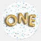 Sweet stickers for your little one's first birthday feature "ONE" spelled out in gold balloons, on a background of blue confetti.