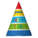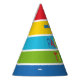 colourful paper hat in primary colours with a fun party time phrase in balloon letters