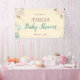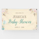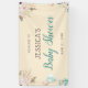 This elegant baby shower banner features soft flowers accented with greenery and feathers. Another graphic in the lower left corner features gift boxes with balloons. The banner offers many colours which make is perfect for a gender neutral baby shower.