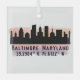 Glass ornament features Baltimore Maryland city skyline silhouette with watercolor splash and latitude & longitude map coordinates