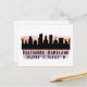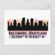 Postcard features Baltimore Maryland city skyline silhouette with watercolor splash and latitude & longitude map coordinates