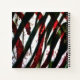 Abstract photo, with broad, random stripes, intertwining in, Bold colours of, black, red, dark-green, olive, and white-resembles, stalks of bamboo.