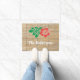 Faux bamboo reed mat background with tropical hibiscus flower and monstera leaf design for your home, beach house, or backyard tiki hut! Edit the text for your name.