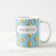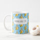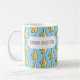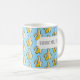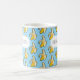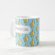 Are you bananas about coffee? A mug featuring the caption "BANANAS ABOUT COFFEE" over a lively pattern of stylised pixel art yellow bananas on a sky blue background.