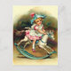 Vintage illustration from the classic children's nursery rhyme, "Ride a Horse to Banbury Cross." A cute little girl is riding a white rocking horse with blue bridles. Her dress and shoes are pink, and her blue hat with pink tassel matches both her outfit and the horse's bridle.