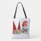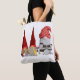 Band of Gnomes playing a guitar, saxophone and drums displayed on a tote bag for conversation while out shopping or just browsing around town