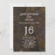 Birthday party invitation template with a guitar design and music theme. Dark brown, distressed background and grunge fonts with his age in centre. Grey text has party title at top with party information in a paragraph to hold all your wording. This design also comes as an instant download.