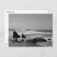 Craggy rocks surge up from the beach as the ocean waves lazily roll into shore. Contrasts of black and white mix with grey, leaving out distractions from the form and expanse the ocean view provides