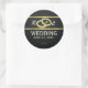 Black and gold elegance! The small circular, embossed pattern and two gold horizontal bands are the background for the featured wedding bands.
