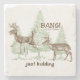 Two deer in the forest. One making gun noise to scare his friend believing it was a hunter. For that man in your life who loves to hunt. Brown and Green.