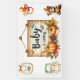 Features “Baby is Coming” text surrounded by pumpkins, fall foliage, a pacifier, and a teddy holding a pumpkin.