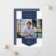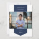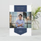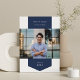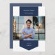 Customise this modern graduation announcement with a horizontal or landscape orientated photo overlaid on a ribbon banner in classic navy blue. Add your graduate's name, school, and graduation year. Personalise the back with an additional photo and a personal message.