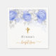 For an elegant baptism, celebrating a baby boy. A chic white background. Decorated with blue and white florals, roses and a faux gold cross. Personalise and add the name of the child. Black and golden letters.