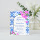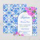 Blue Tiles and Bougainvillea elegant Mediterranean Greek Santorini Mykonos themed baby christening baptism budget invitation template.