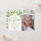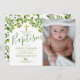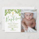 Gender neutral baptism/christening invitations featuring a classic white background that can be changed to any colour, watercolor tree branches with lush green foliage, a religious gold cross, a photo of your child, and a modern text template that is easy to personalise.
