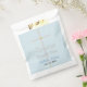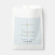Elegant Baptism Son Thank You Paper Favour Bags with simple hand-painted Silver Cross with Gold Accents. Personalise name in blue script, and date in black text against a light blue background. Click Customise to Edit font size or colour. Original Graphic Artwork and Design © TamiraZDesigns.