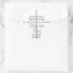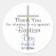 Thank You Baptism Son round stickers. Simple hand-painted silver cross with gold accents against a white background. Personalise with your child's name shown in elegant blue script, and date in black text. Original Graphic Artwork and Design © TamiraZDesigns.