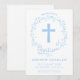 This modern Baptism or Christening invite features an elegant watercolor style blue floral wreath as well as a blue cross. Ideal for a baby boy's religious celebration, it can be customised with your child's name and the event details. The background colour can also be changed to your liking.