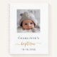 For an elegant baptism, gender neutral. A chic white background. Personalise and add a square sized photo on the front, the name of the child and the date of the baptism. Black and golden letters.