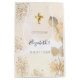 For a baptism, gender neutral. A golden watercolored gold background with brush strokes and with faux glitter dust. Decorated with golden eucalyptus leaves, foliage. Personalise and add a date and name. The name is written in with a modern hand lettered style script.