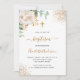 A white background decorated with eucalyptus greenery, a white rose, and golden leaves and faux gold glitter drops. Personalise and the childs name and ceremony details. Black and golden coloured letters. Gender neutral.