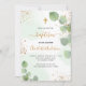A white and light green background decorated with eucalyptus greenery and faux gold glitter dust. Personalise and the childs name and ceremony details. Black and golden coloured letters. Gender neutral.