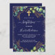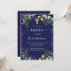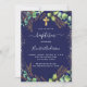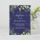 A navy blue background decorated with eucalyptus greenery and golden leaves and faux gold glitter sparkles. A golden cross. Personalise and the child's name and ceremony details.