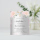 A modern, stylish and glamourous invitation for a baptism celebrating a baby girl. A faux silver metallic looking background with pink faux glitter, sparkles, and blush pink florals. The name is written with a modern hand lettered style script. Personalise and add your details.