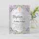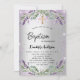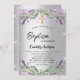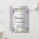 A modern, stylish and glamourous invitation for a baptism celebrating a baby girl. A faux silver looking background with violet faux glitter, sparkles, lavender florals, flowers and eucalyptus greenery. The name is written with a modern hand lettered style script. Personalise and add your details.