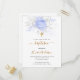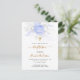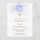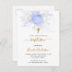 For an elegant baptism, celebrating a baby boy. A chic white background. Decorated with light blue and white florals, roses and a faux gold cross. Personalise and add the name of the child and details. Black and golden letters.