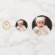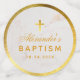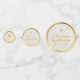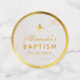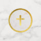 On the other side, there is golden text inside a white marble circle with faux gold foil border, and has a faux gold cross above it. The name is written in an elegant calligraphic script. The smallest confetti has just the cross inside the gold circle on both sides.