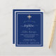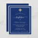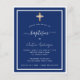 A modern, elegant and invitation. A navy blue background decorated with white frames and a golden cross. Personalize and add a name and details. White text.