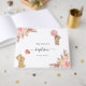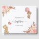 A white background. Decorated with rose gold, pink florals, pampas grass and two teddy bears. Personalise and add a name and date.