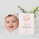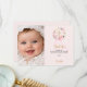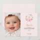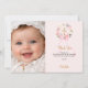 A modern and elegant baptism thank you card. A blush pink background decorated with a watercolored pink and ivory floral wreath, a bow and a golden cross. Personalize and add your photo of the child, thank you note and name.
