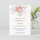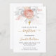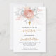 For an elegant baptism, celebrating a baby girl. A chic white background. Decorated with rose gold and white florals, roses and a faux gold cross. Personalise and add the name of the child and details. Black and golden letters.