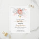 For an elegant baptism, celebrating a baby girl. A chic white background. Decorated with rose gold and white florals, roses and a faux gold cross. Personalise and add the name of the child and details. Black and golden letters.
