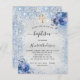 A modern, elegant baptism, celebrating a baby boy. Faux silver looking background decorated with blue faux glitter and florals. A golden cross. Personalise and add a name and party details. Black coloured letters.