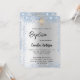 A modern, elegant baptism, celebrating a baby boy. Faux silver metallic looking background decorated with blue faux glitter, sparkles and a golden cross. Personalise and add a name and party details. Black coloured letters.